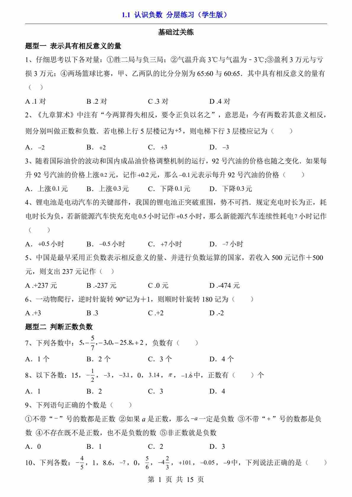 1.1 认识负数(分层练习)