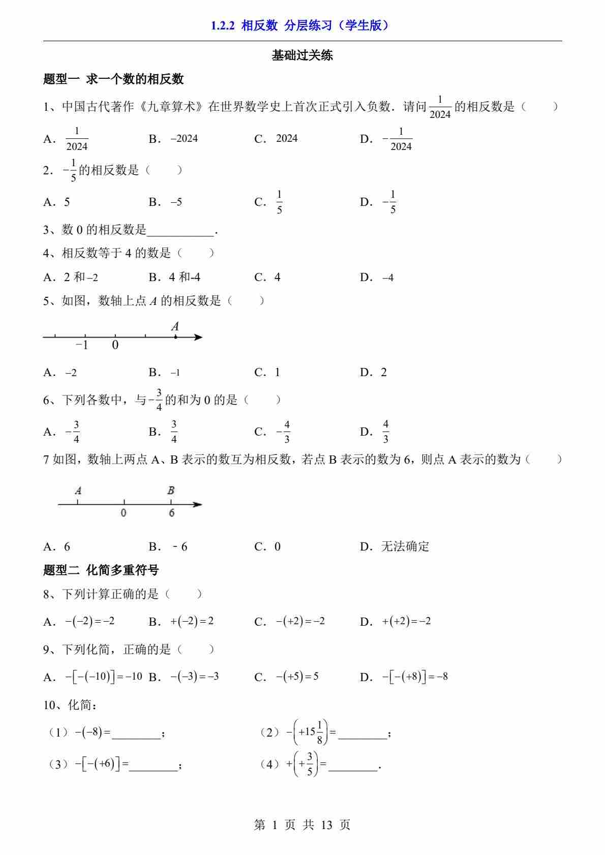 1.2.2 相反数(分层练习)