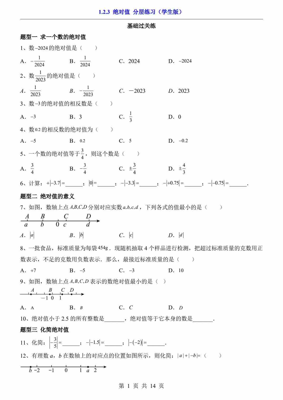 1.2.3 绝对值(分层练习)