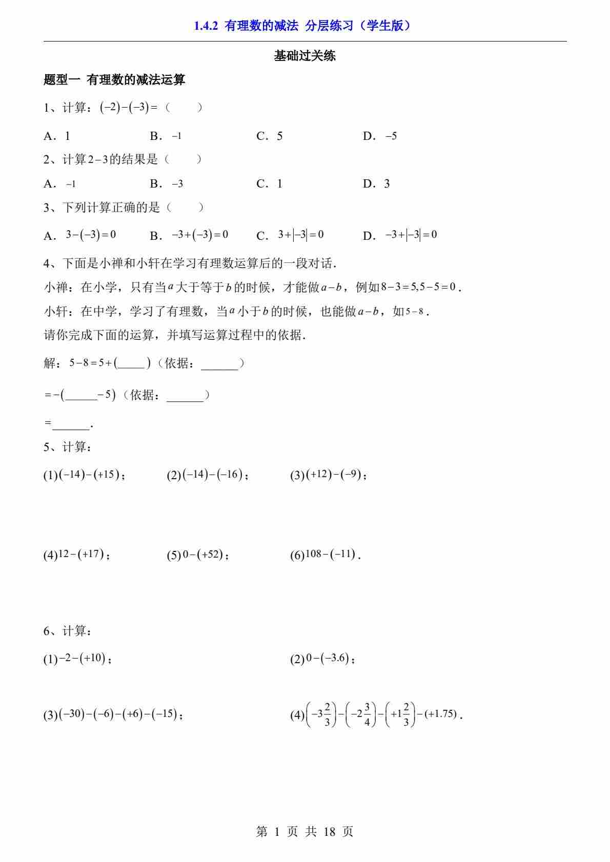 1.4.2 有理数的减法(分层练习)