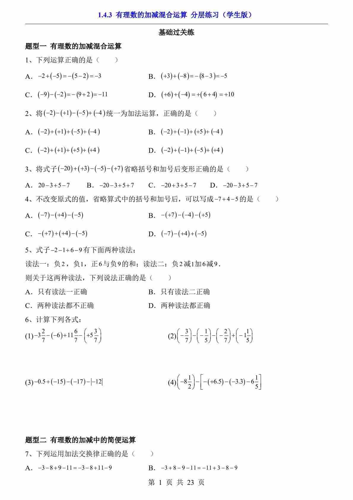 1.4.3 有理数的加减混合运算(分层练习)