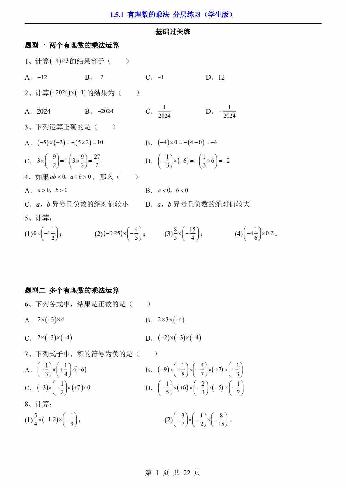 1.5.1 有理数的乘法(分层练习)