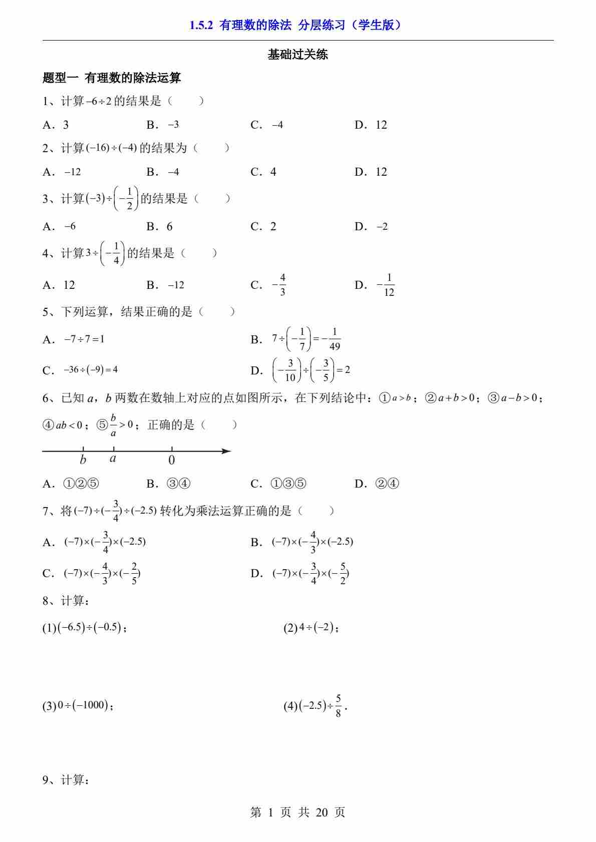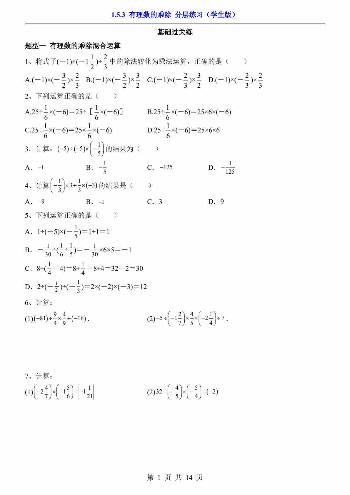 1.5.3 有理数的乘除(分层练习)