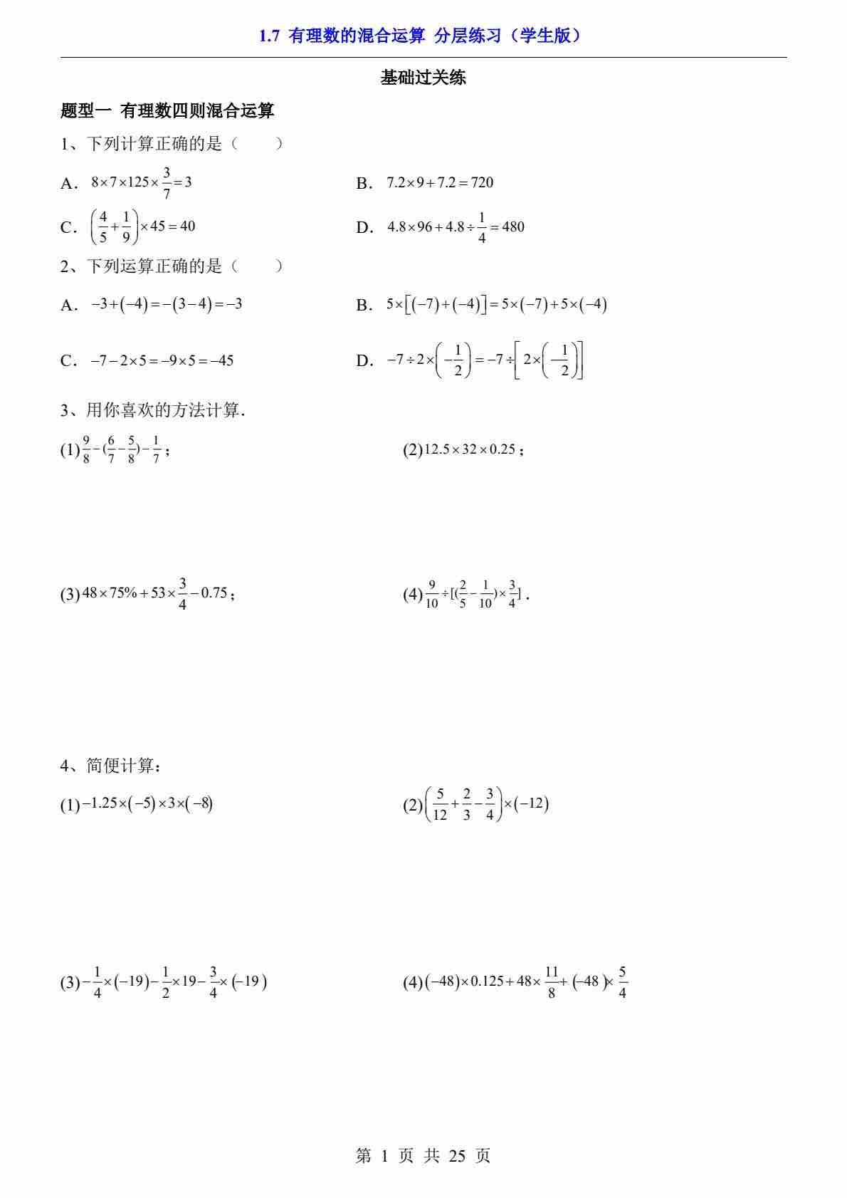 1.7 有理数的混合运算(分层练习)