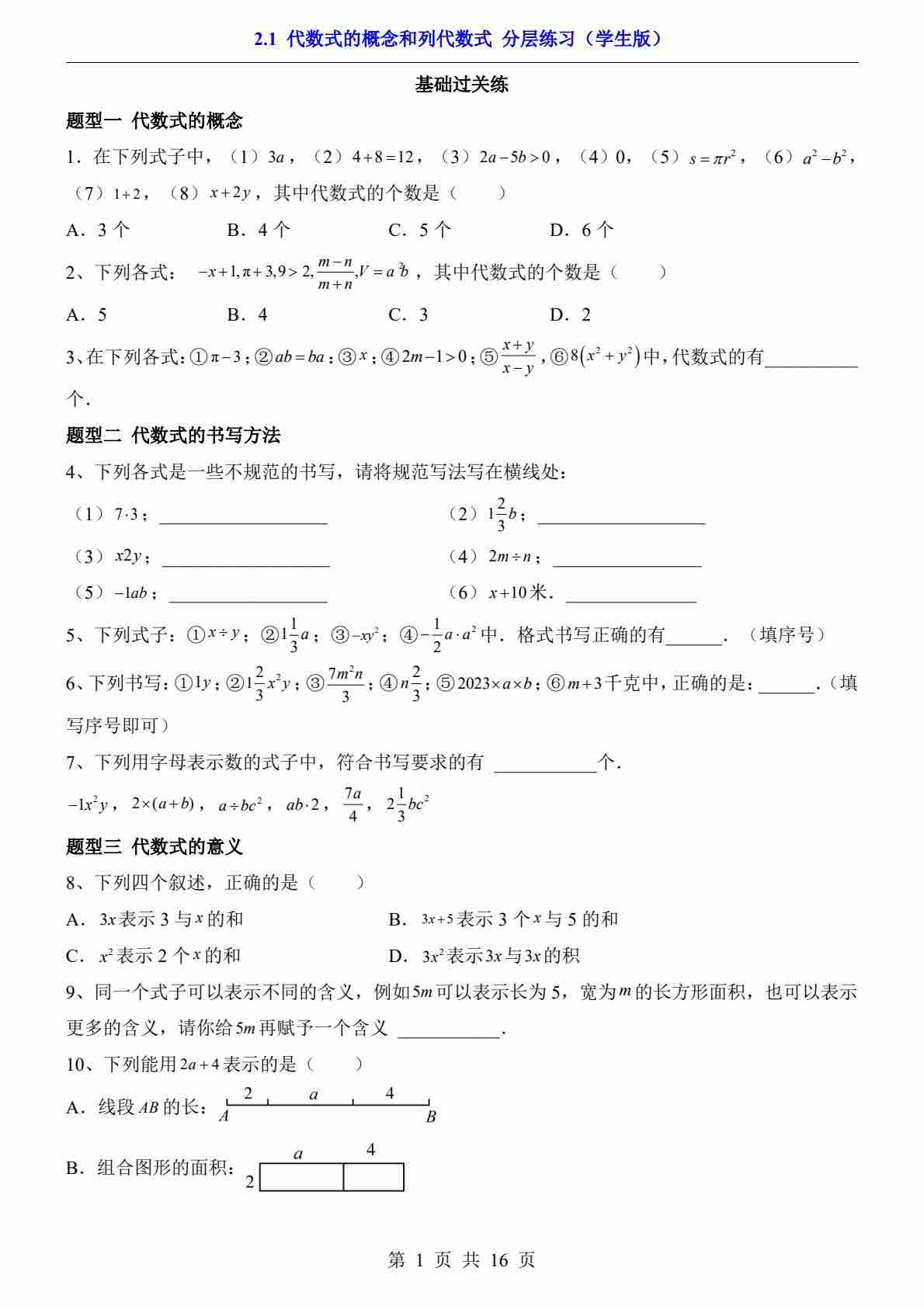 2.1 代数式的概念和列代数式(分层练习)