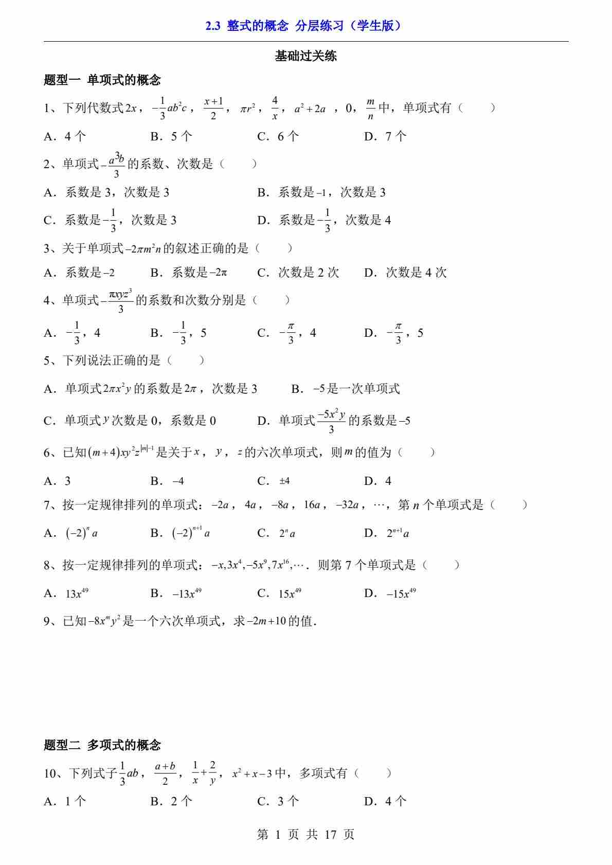 2.3 整式的概念(分层练习)