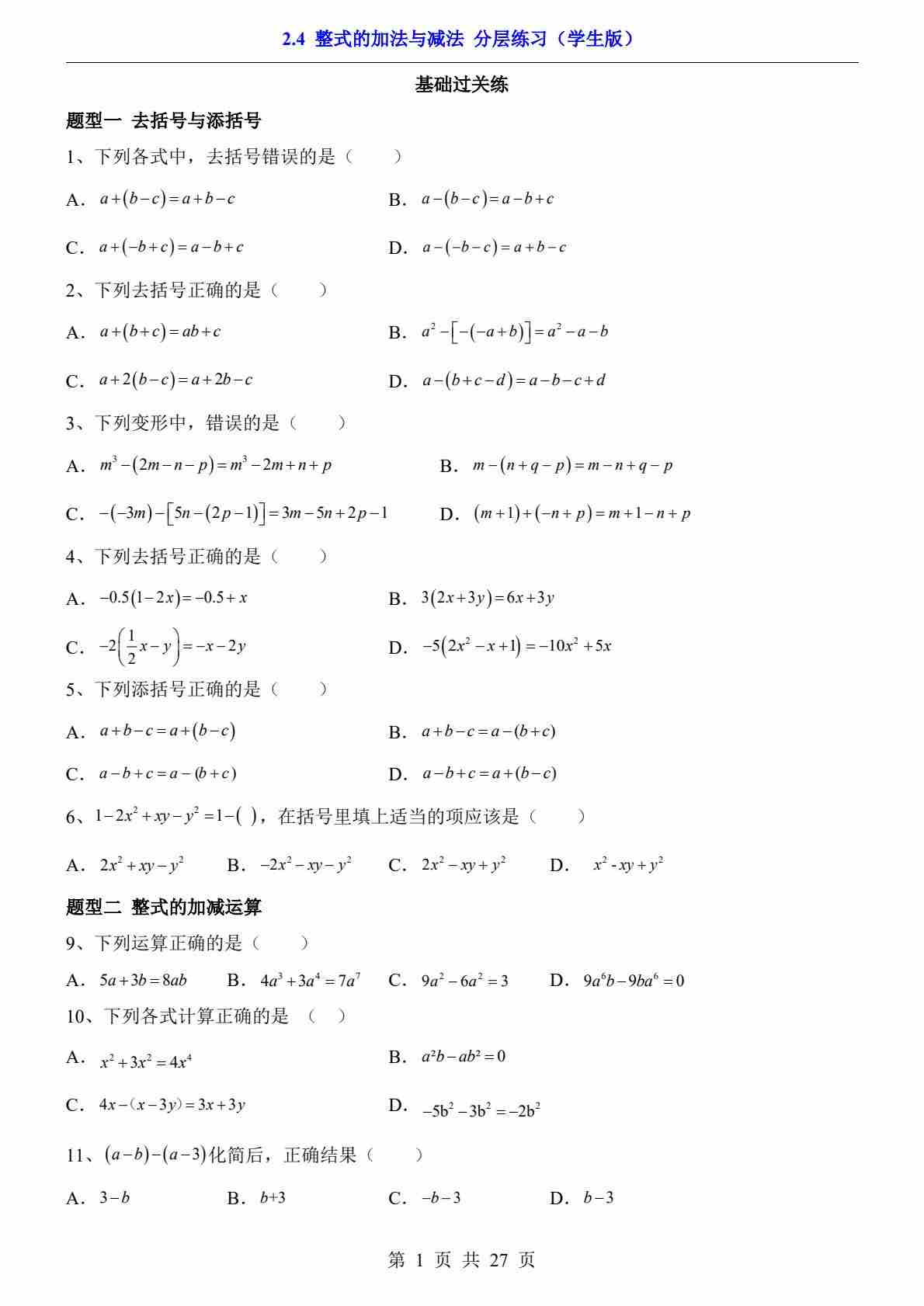 2.4 整式的加法与减法(分层练习)