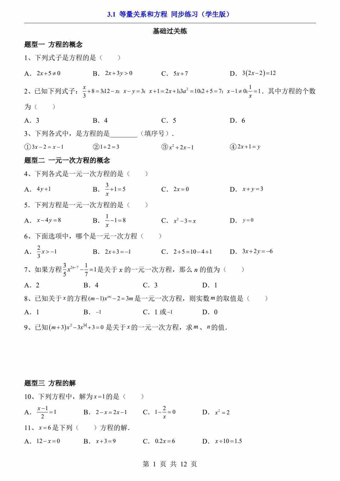 3.1 等量关系和方程(分层练习)
