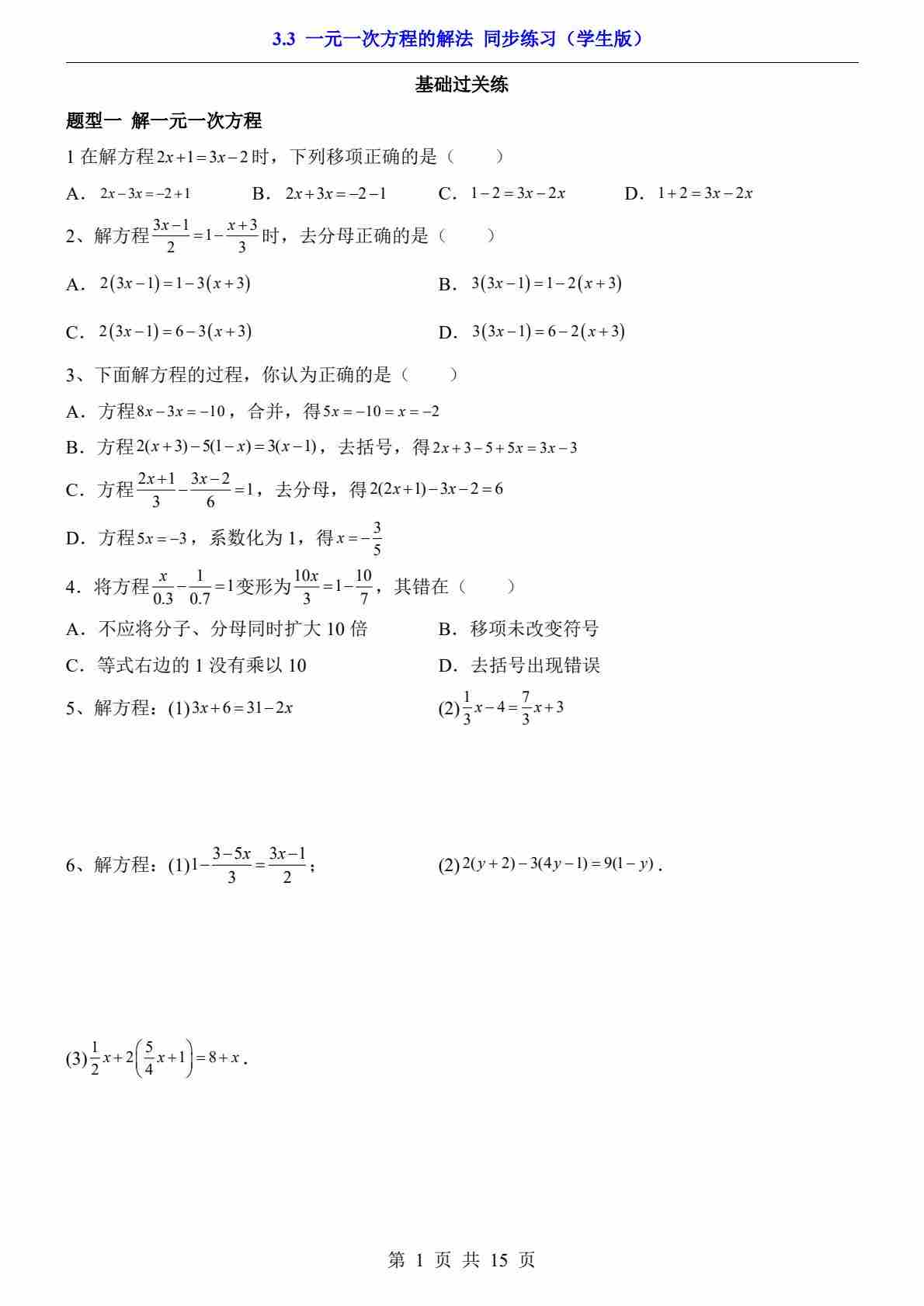 3.3 一元一次方程的解法(分层练习)