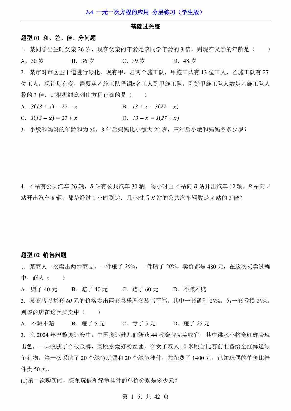 3.4 一元一次方程的应用(分层练习)