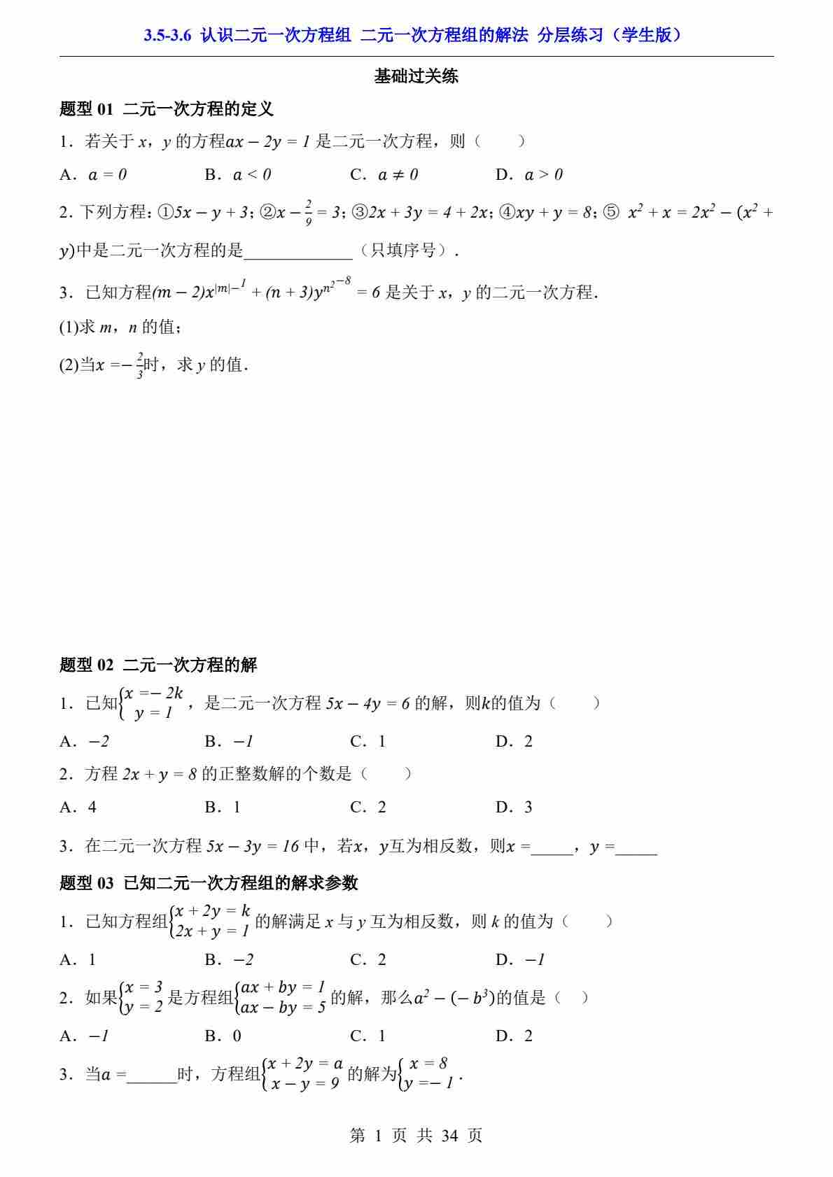 3.5-3.6 认识二元一次方程组 二元一次方程组的解法(分层练习)