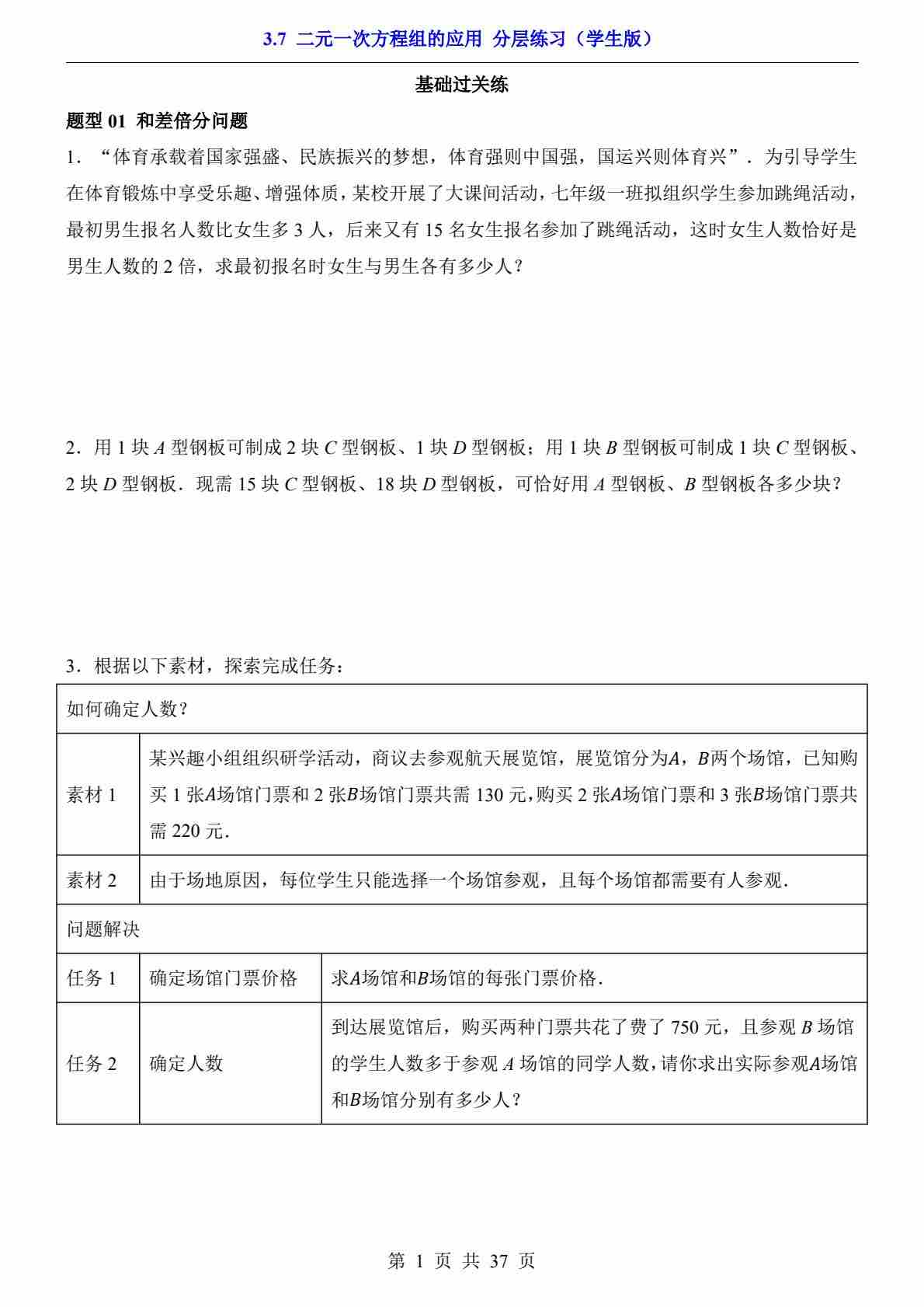 3.7 二元一次方程组的应用(分层练习)