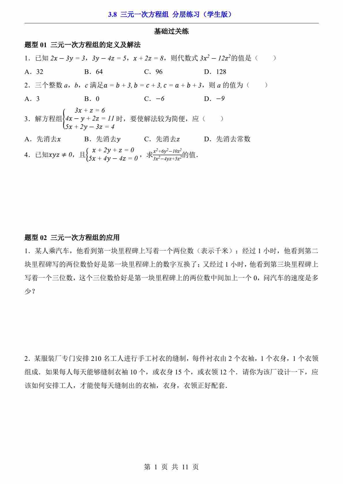 3.8 三元一次方程组(分层练习)