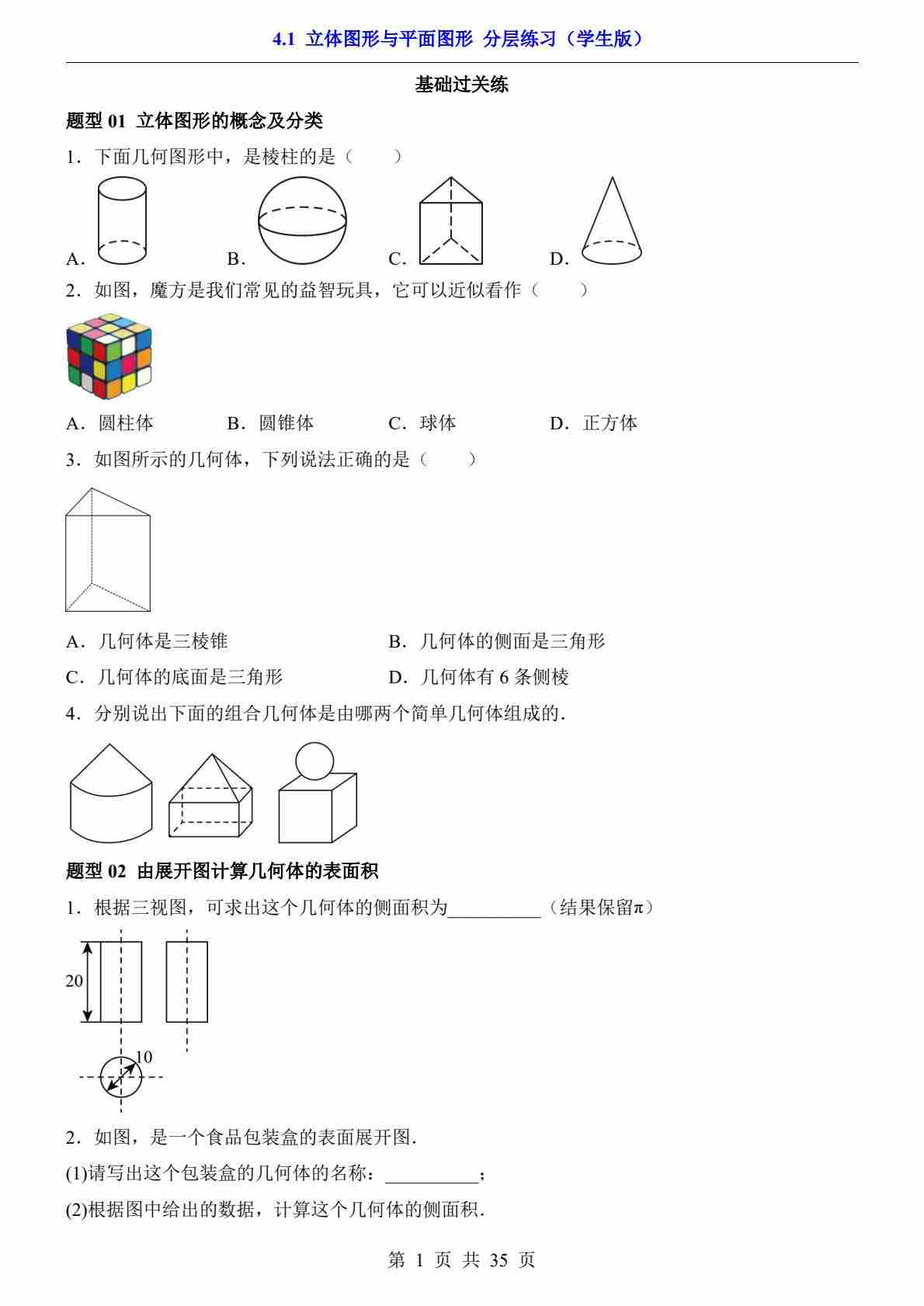 4.1 立体图形与平面图形(分层练习)