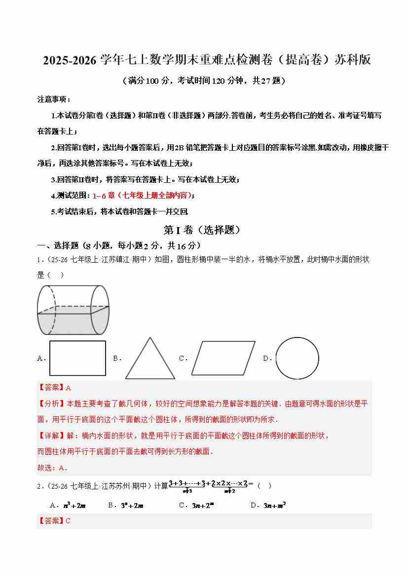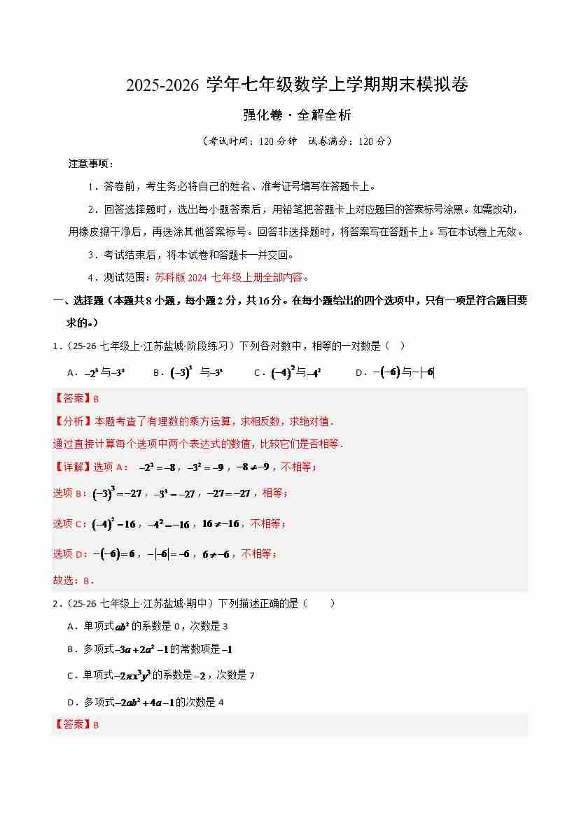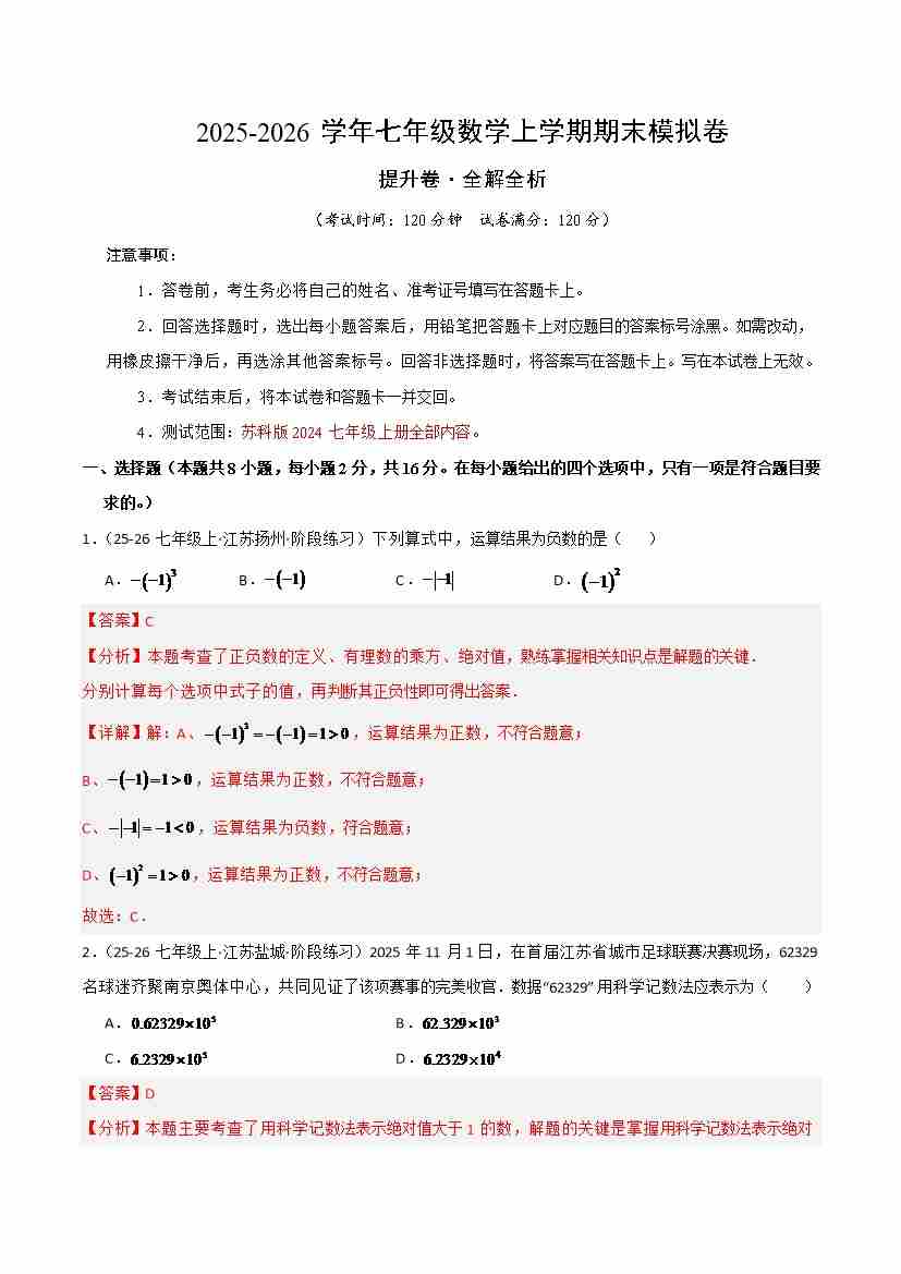 七年级数学上学期期末模拟卷·培优卷(苏科版2024,举一反三)(解析版)