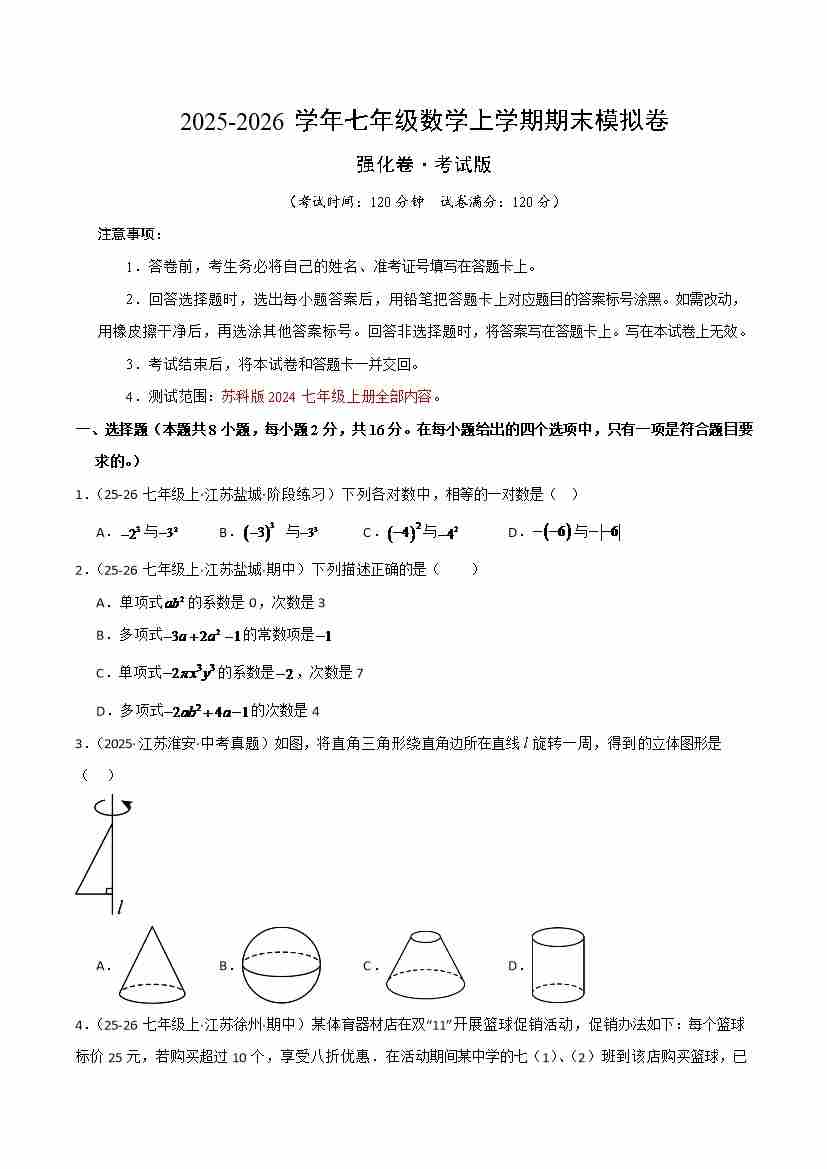 七年级数学期末模拟卷(考试版)【测试范围:人教版2024七年级上册全部】(南通专用)