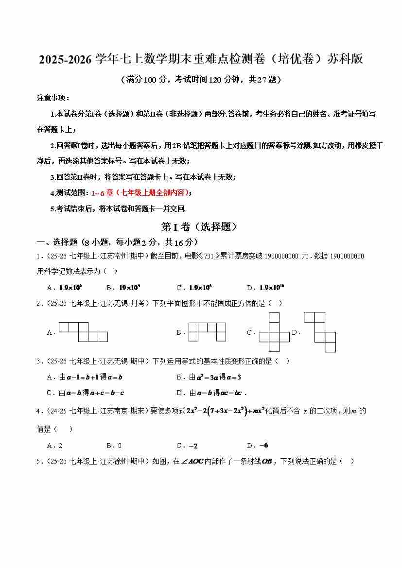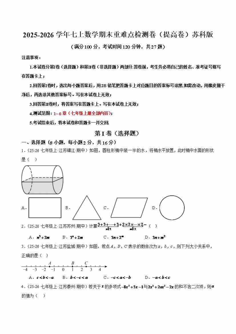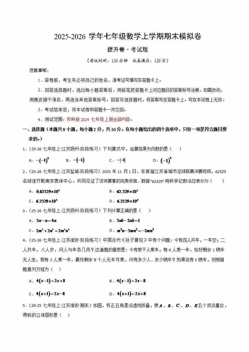 七年级数学上学期期末模拟卷·培优卷(苏科版2024,举一反三)(原卷版)