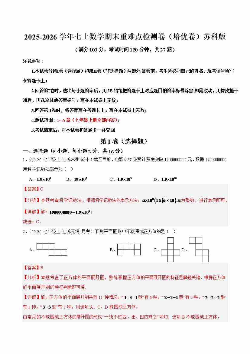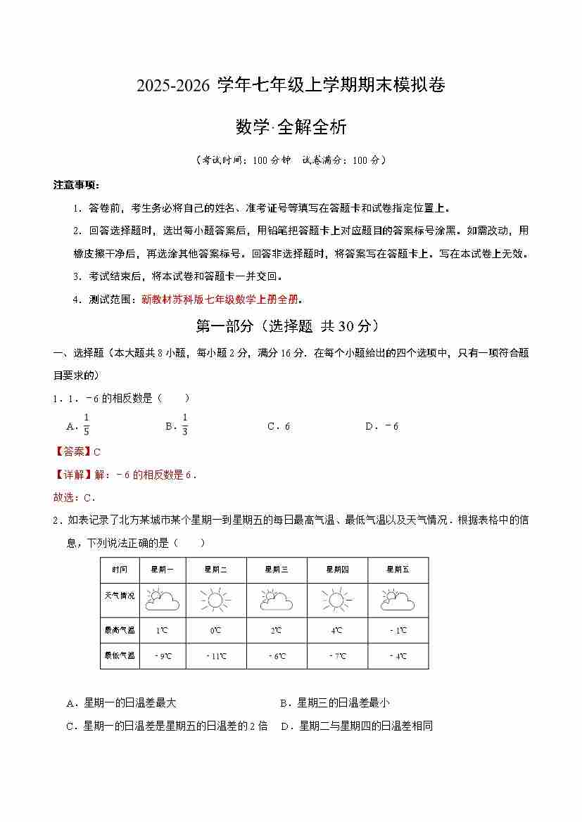 期末模拟卷(考试范围:七上全部内容)(解析版)