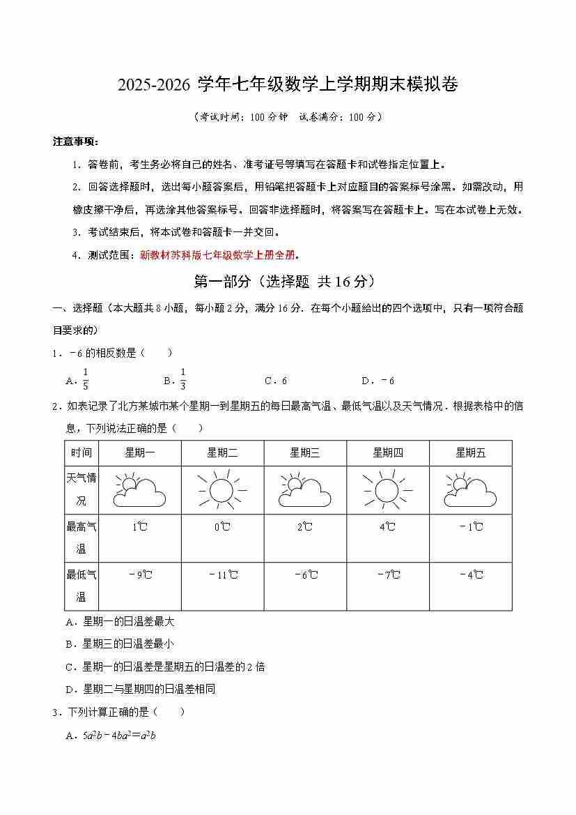 七年级数学期末模拟卷(考试版)【测试范围:七年级上册全部】(苏科版2024)
