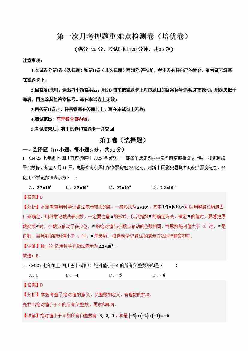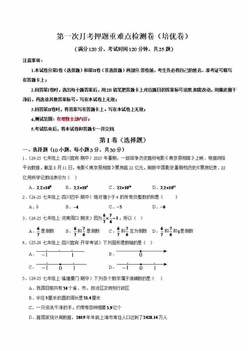 第一次月考押题重难点检测卷(培优卷)(考试范围:有理数全部内容)(学生版)
