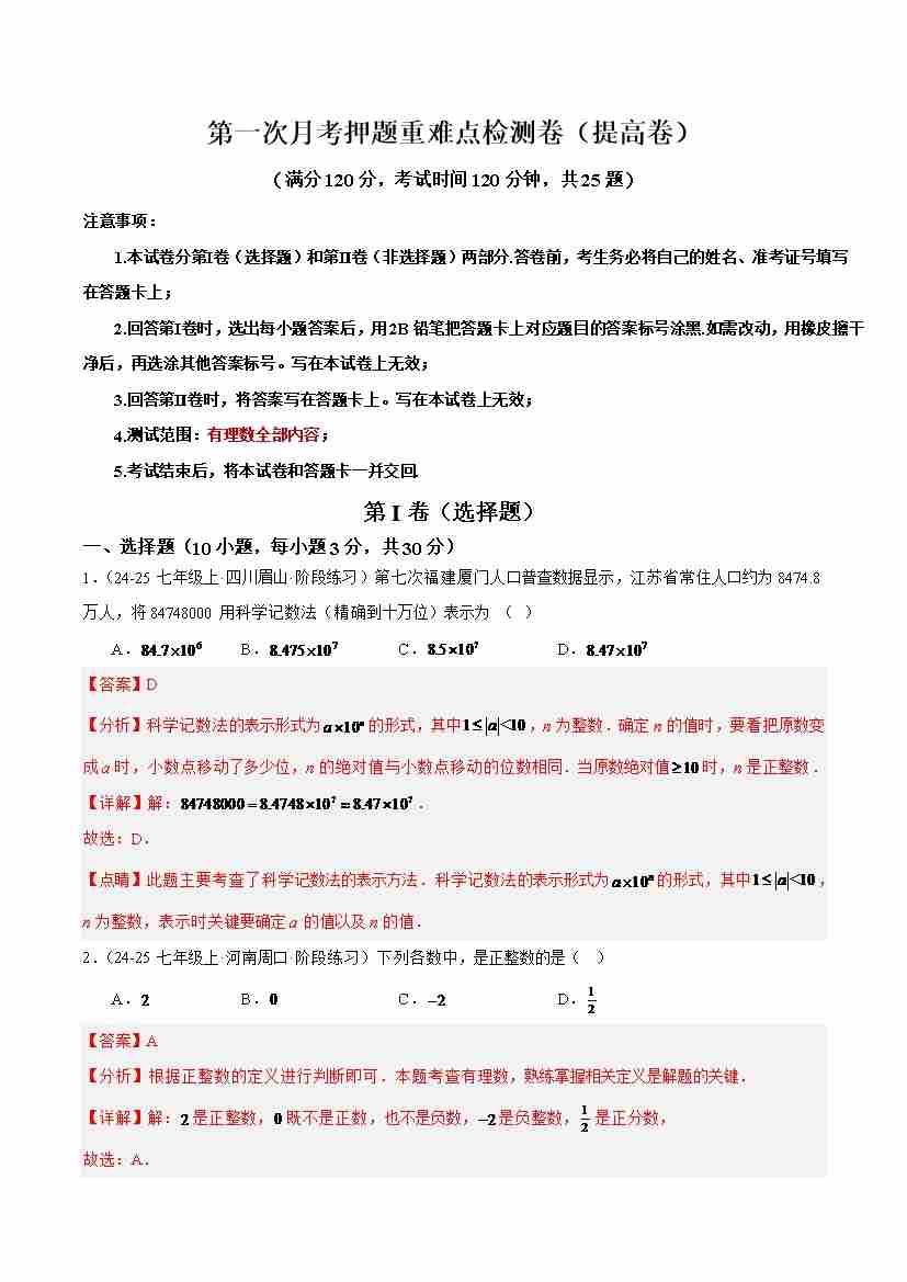 第一次月考押题重难点检测卷(提高卷)(考试范围:有理数全部内容)(教师版)