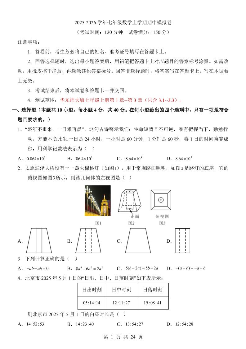 七年级数学上学期期中模拟卷·拔尖卷(华东师大版2024,举一反三)(原卷版)1
