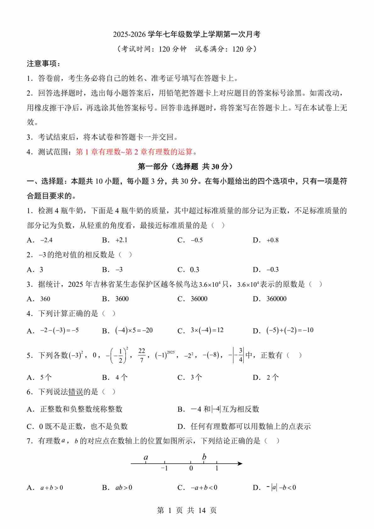 【青岛】7上数学第1次月考【第1-2章】