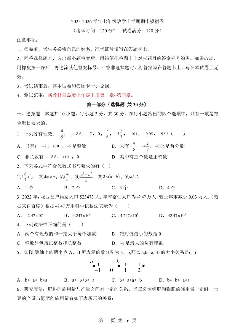 2024-2025学年青岛版七年级上学期(新教材)期中模拟试卷02(原卷版)
