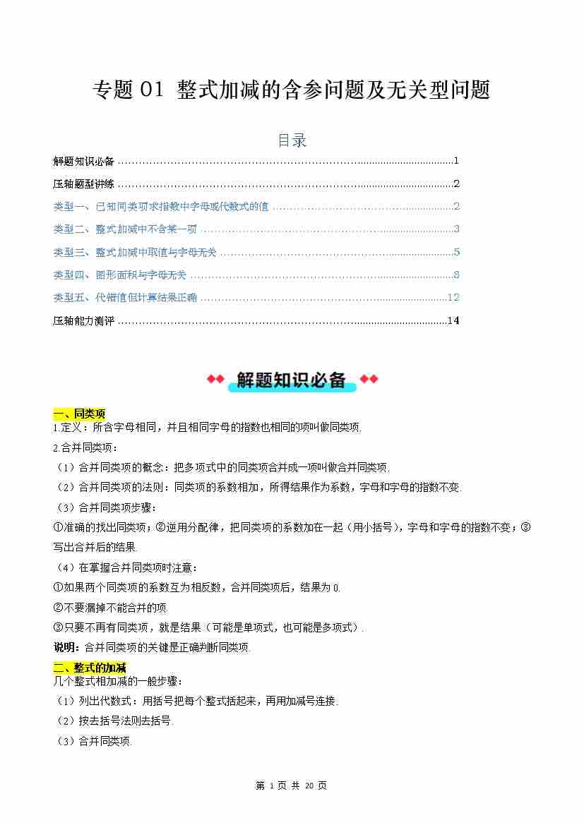 【沪教】专题01:整式加减的含参问题及无关型问题(五大类型)(原卷版)