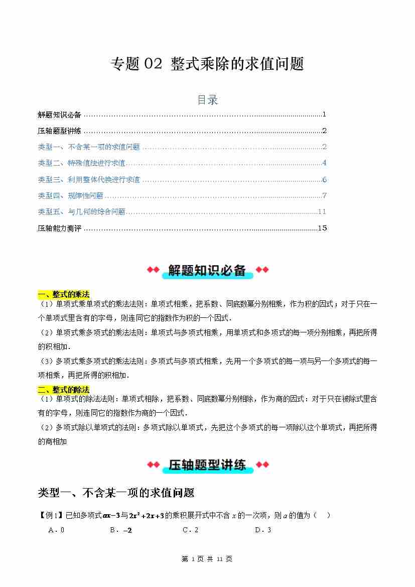 【沪教】专题02:整式乘除的求值问题(五大类型)(原卷版)