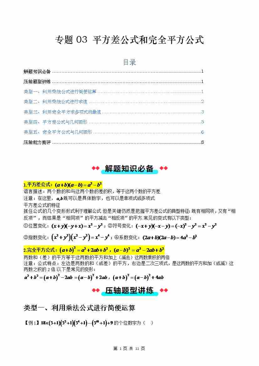 【沪教】专题03:平方差公式和完全平方公式(五大类型)(原卷版)