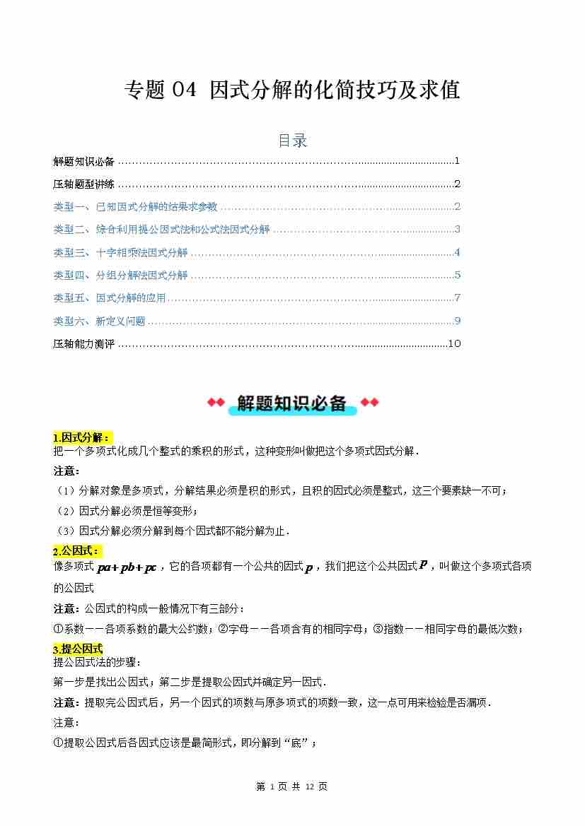 【沪教】专题04:因式分解的化简技巧及求值(六大类型)(原卷版)