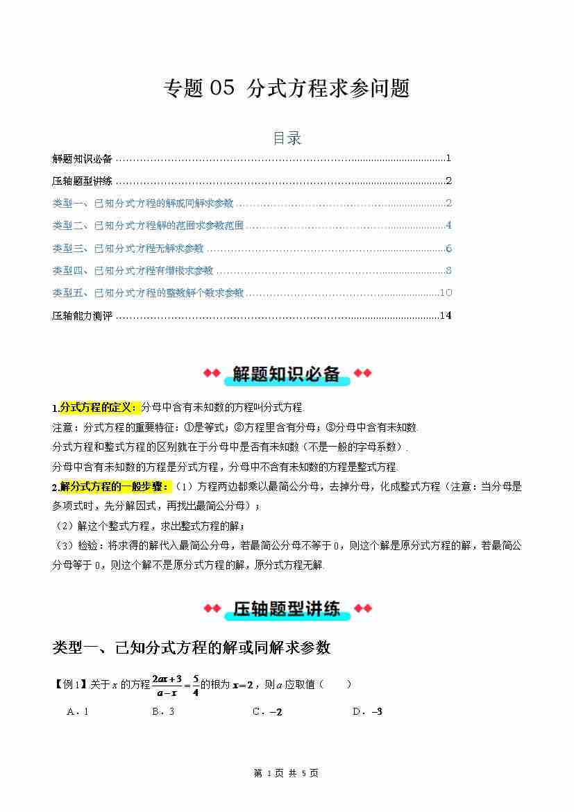 【沪教】专题05:分式方程求参问题(五大类型)(原卷版)