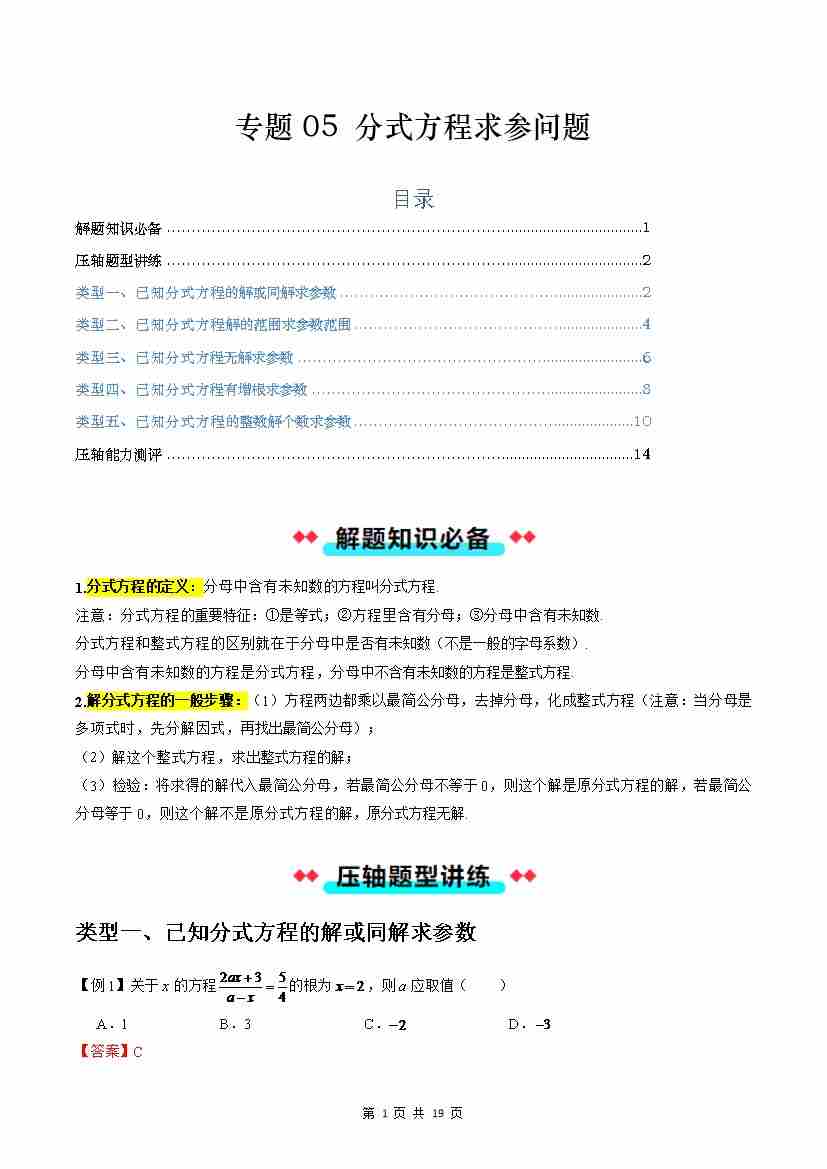 【沪教】专题05:分式方程求参问题(五大类型)(解析版)
