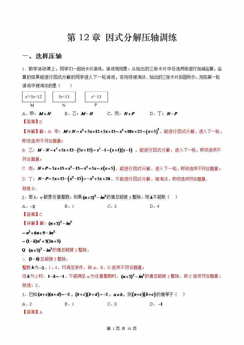 【沪教】第12章:因式分解压轴训练(解析版)