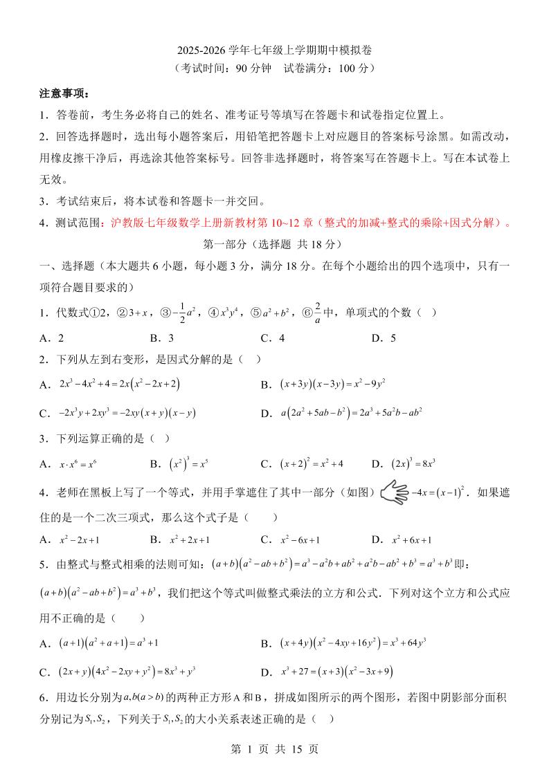 七上数学期中模拟卷01(沪教版2024)原卷版