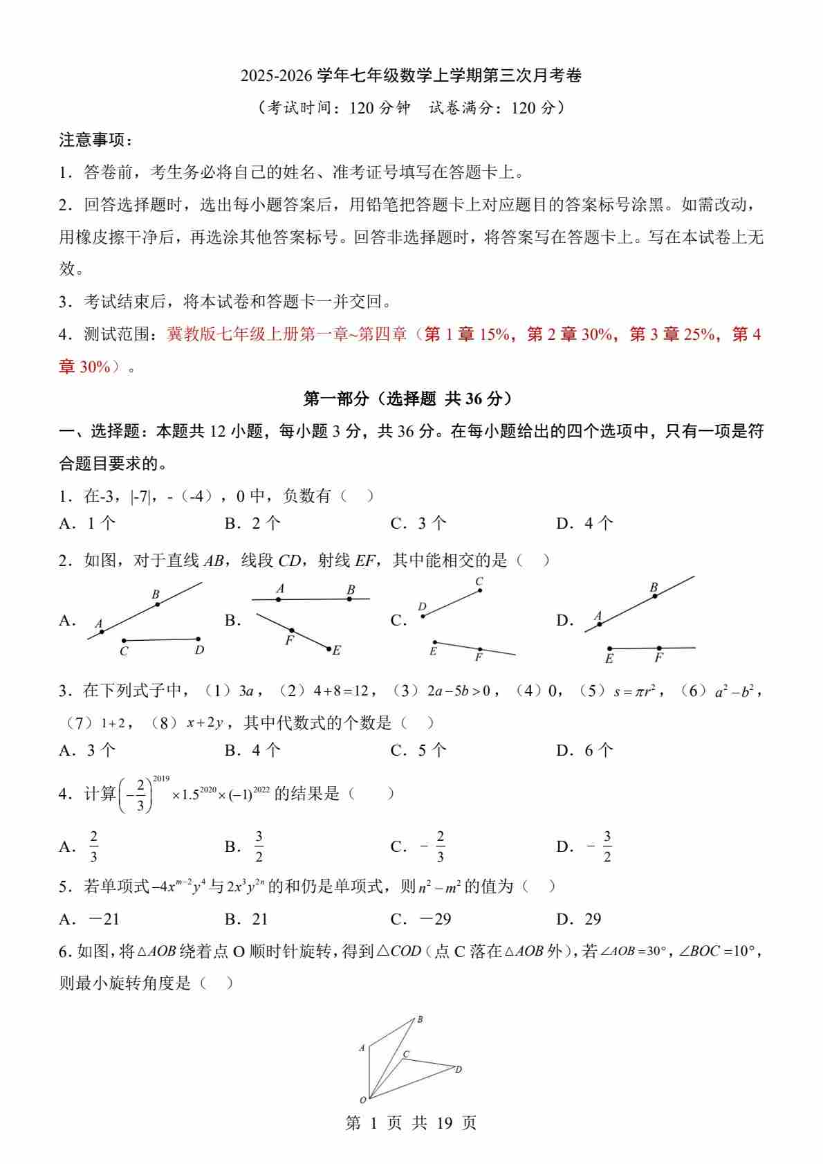 【冀教】7上数学第3次月考【第1-4章】25秋