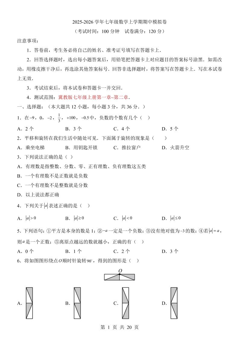 七年级数学期中模拟卷【测试范围:七上第1~3章】(考试版A4)(冀教版2024)