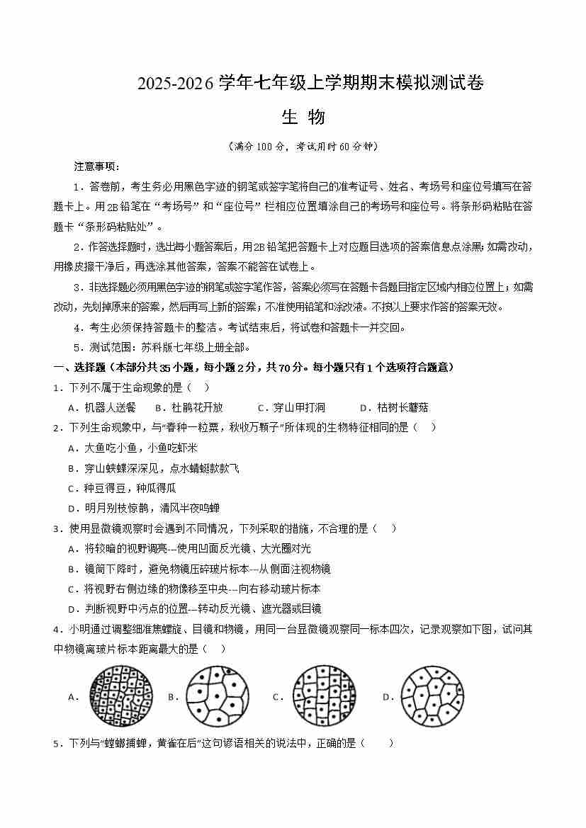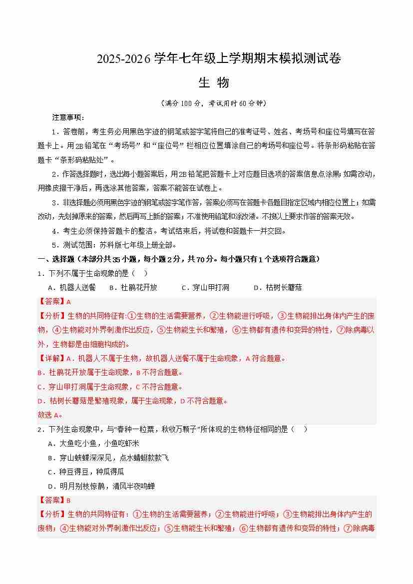 【苏科】7上生物期末卷【七上全册】