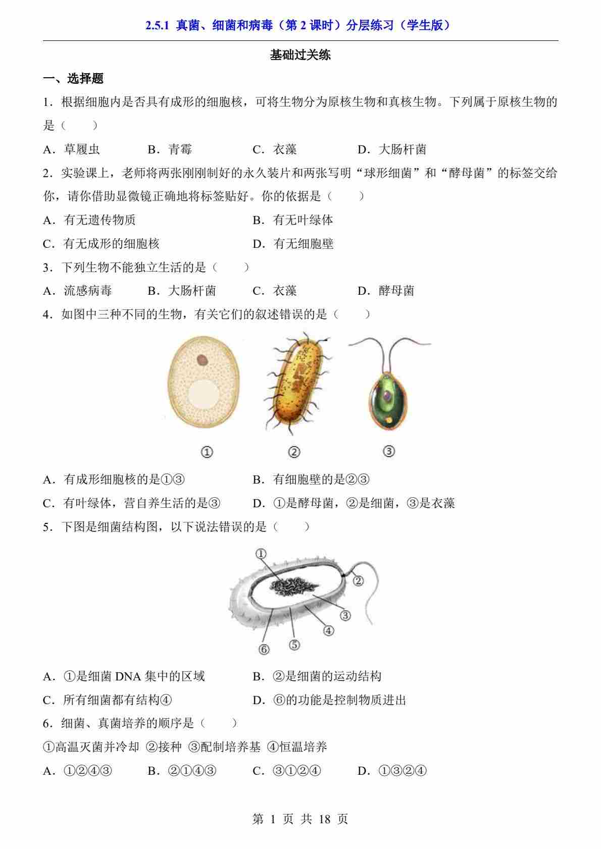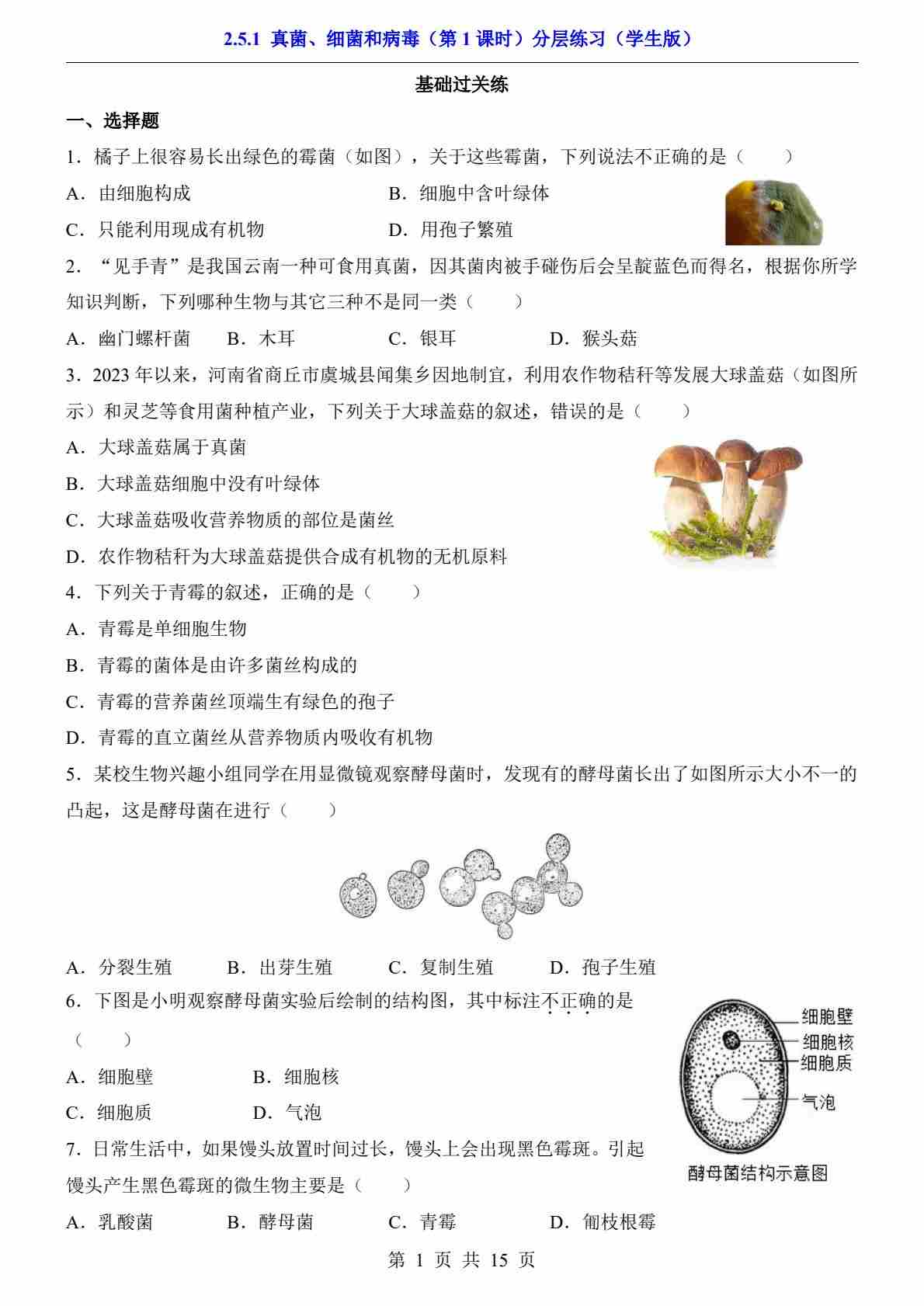 2.5.1 真菌、细菌和病毒 第1课时(分层练习)
