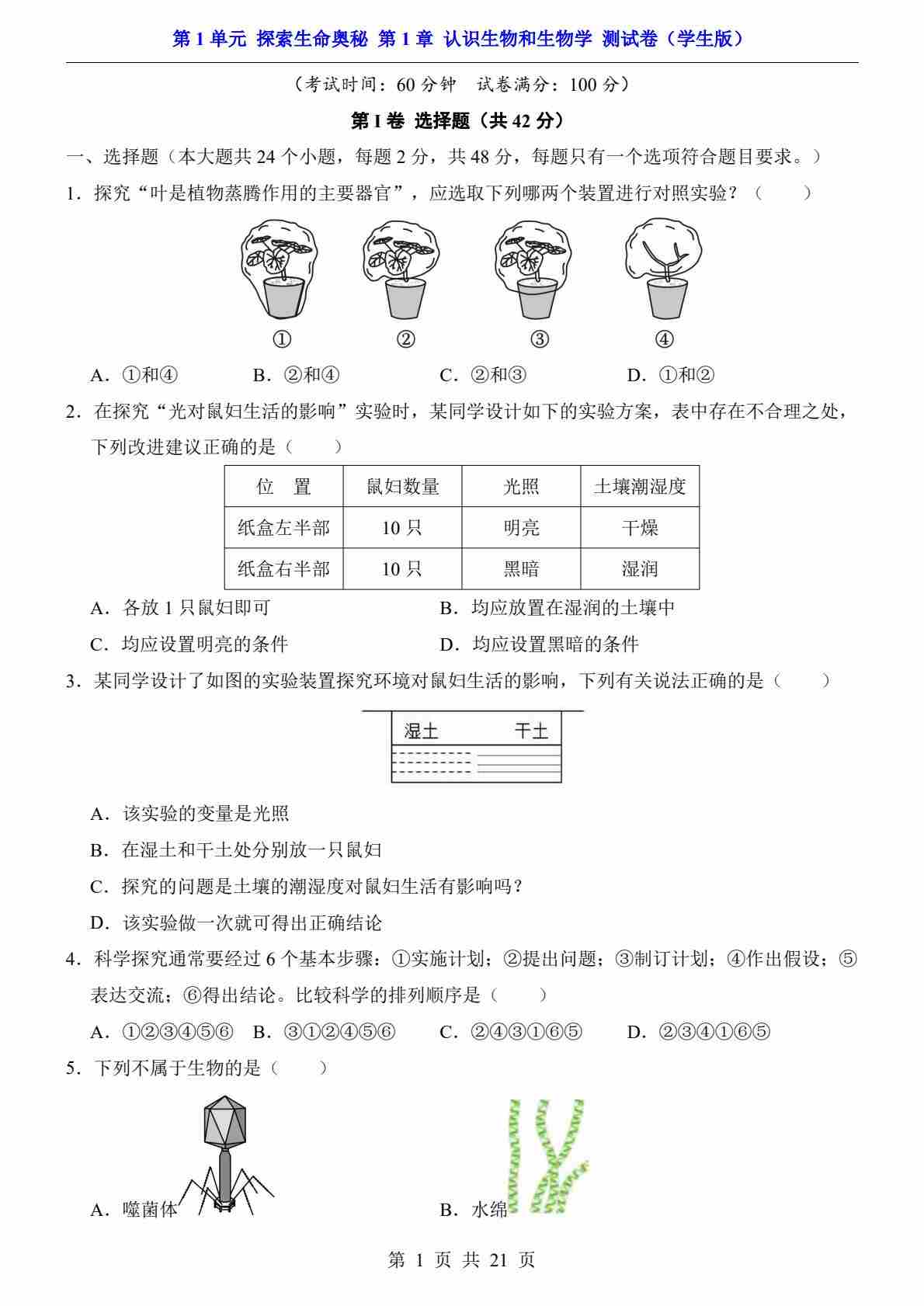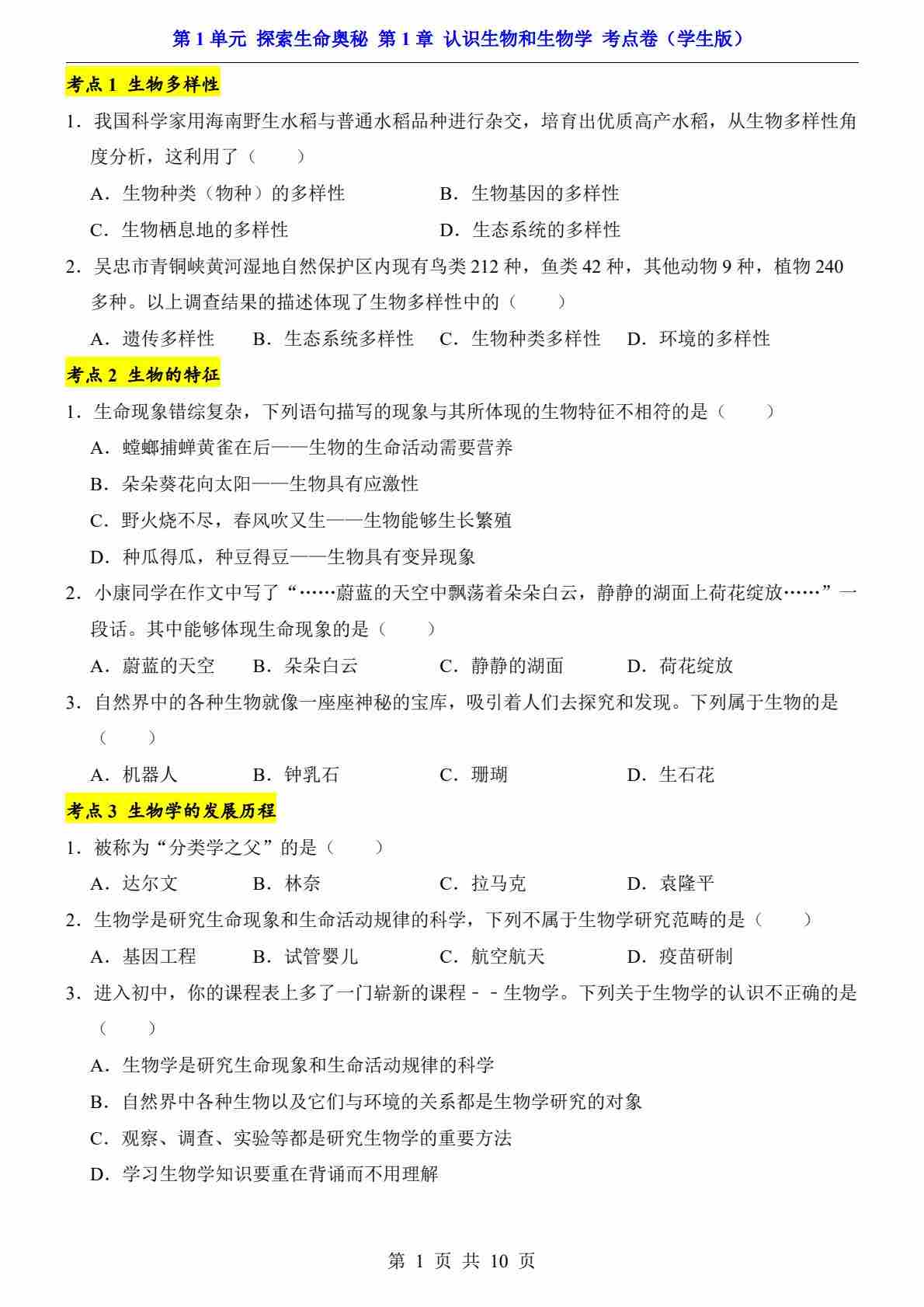 第1单元 第1章 认识生物和生物学(考点卷)