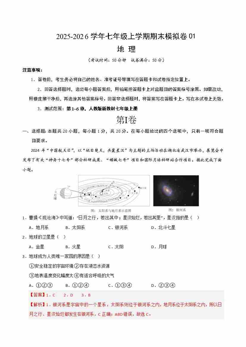 【人教】7上地理期末卷01【7上全册】