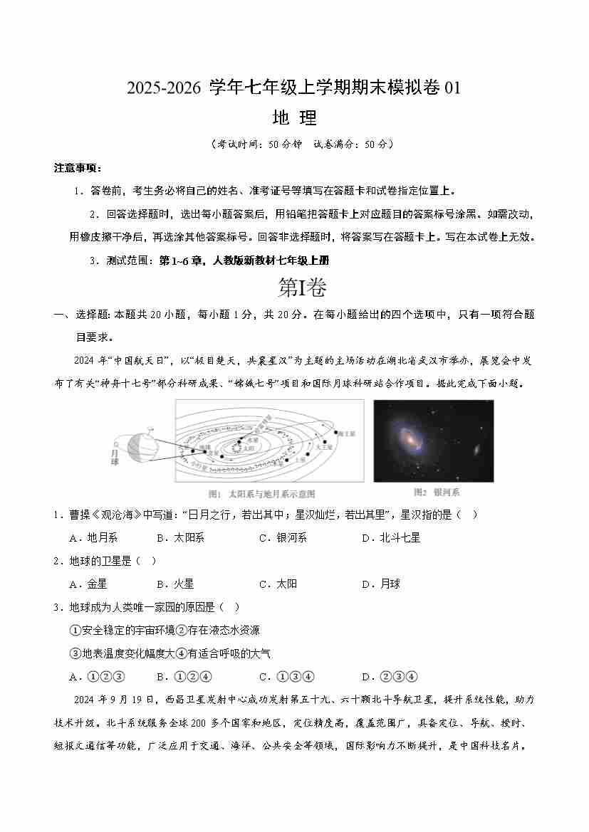 七年级地理上学期期末模拟卷01(新教材人教版)(考试版)