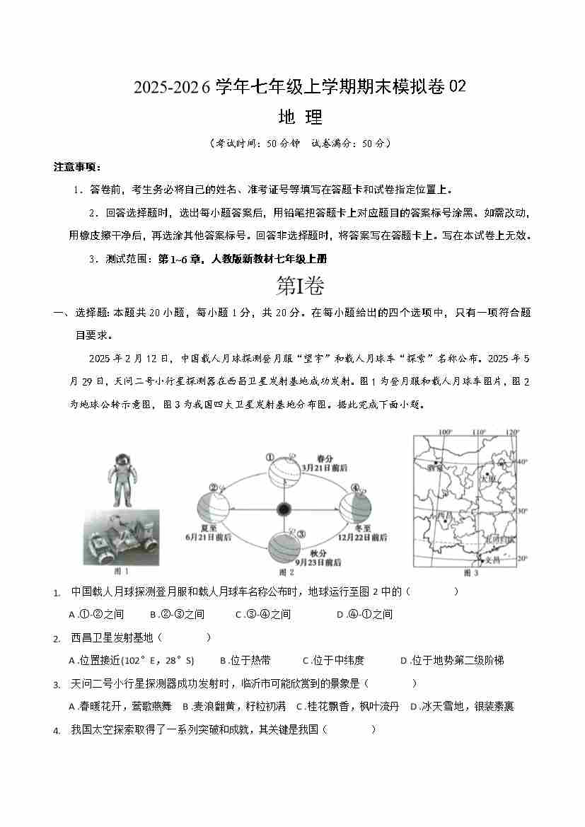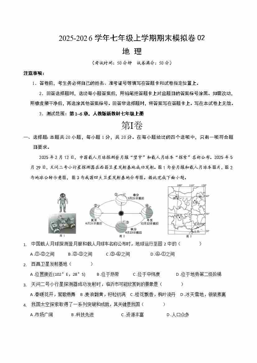 七年级地理上学期期末模拟卷02(新教材人教版)(考试版)
