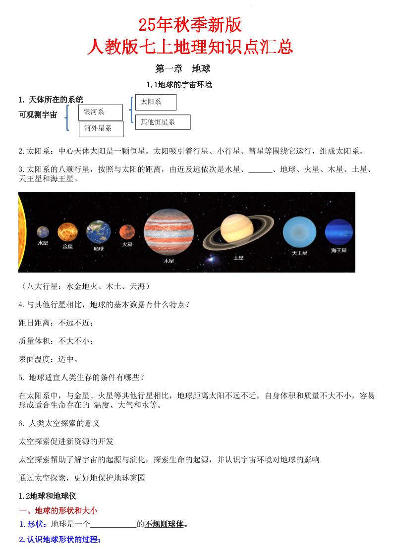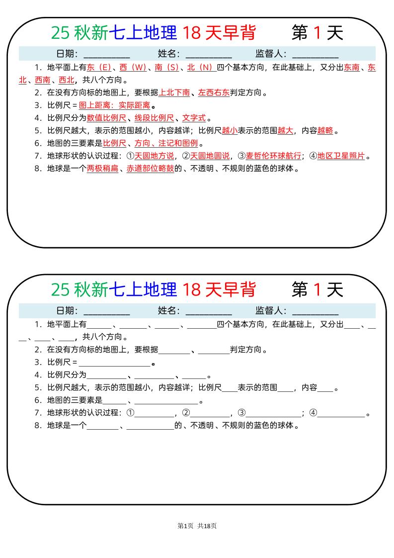 25秋新七上地理18天早背晚默_