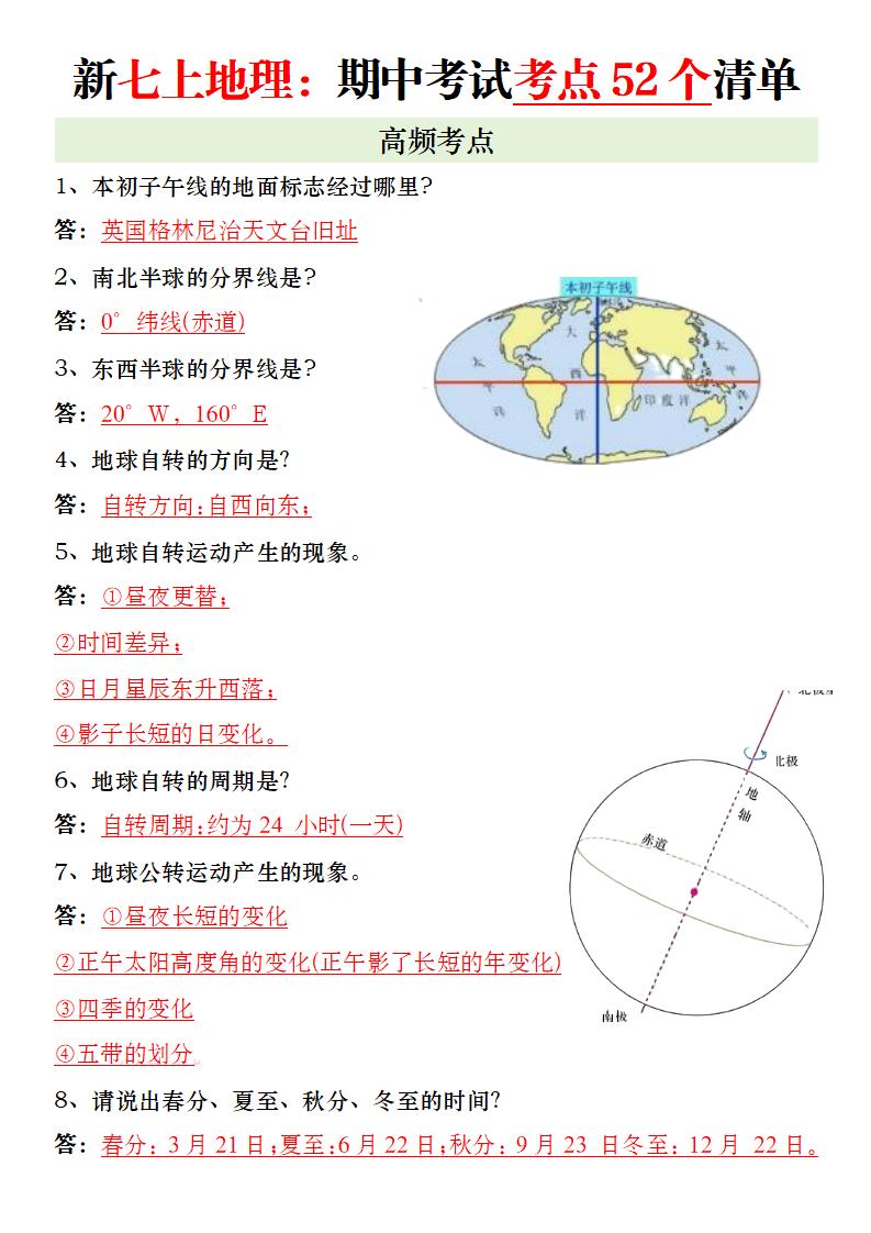 新七上地理:期中考试考点52个清单11