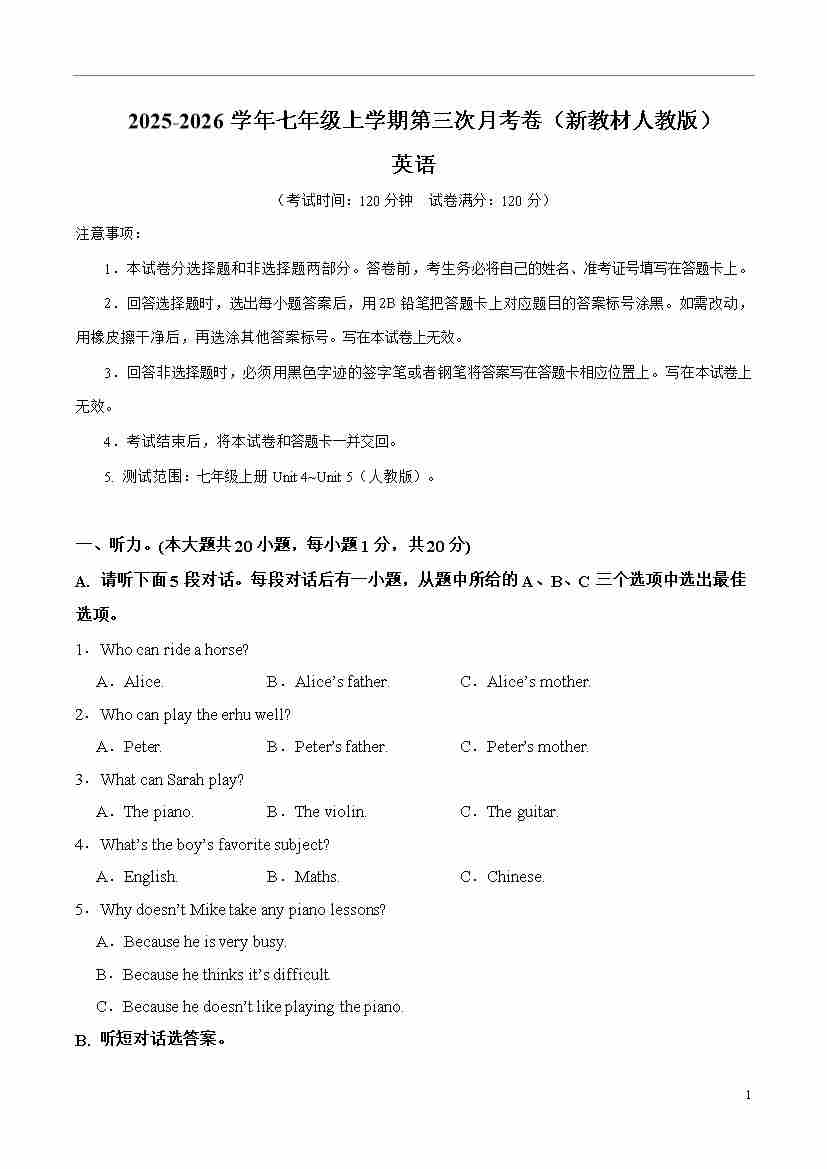 七年级英语第三次月考卷(听力音频)(安徽专用)