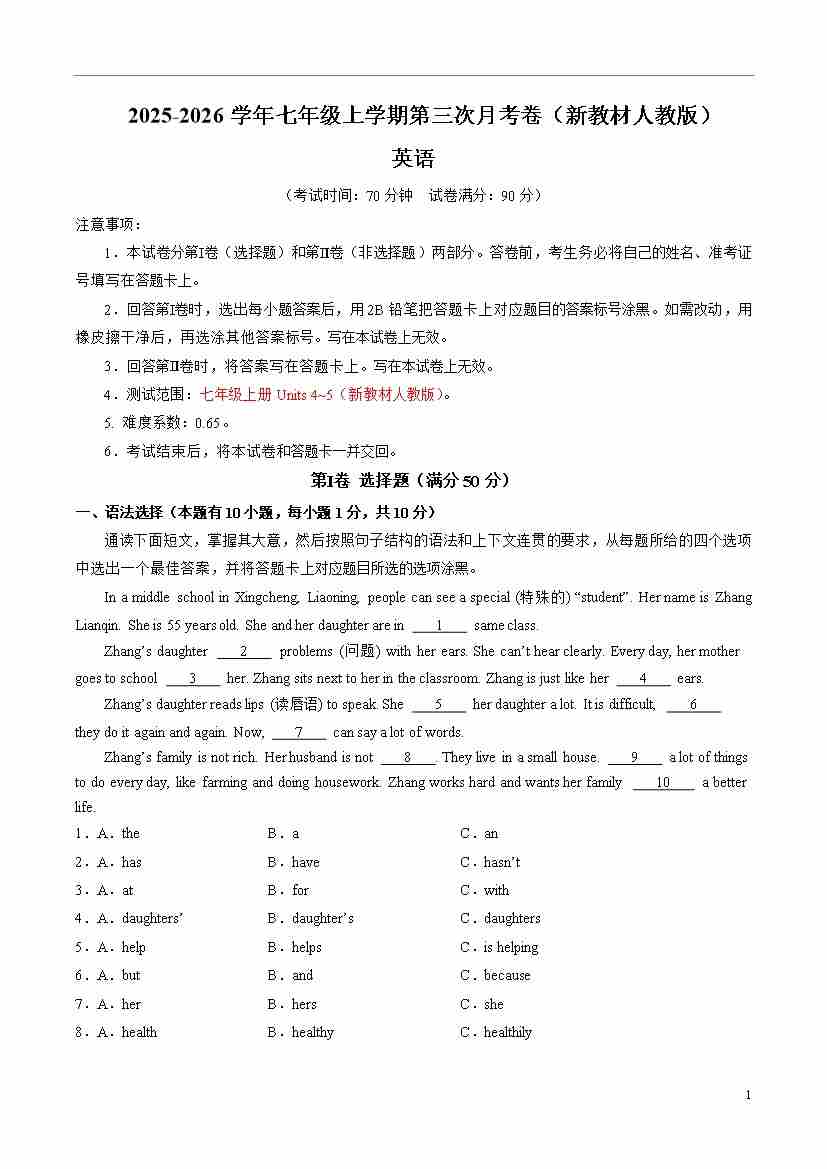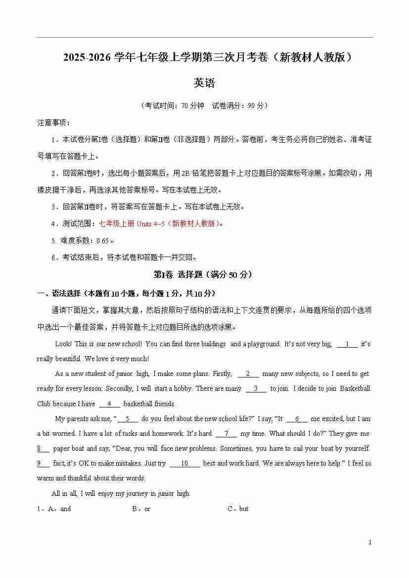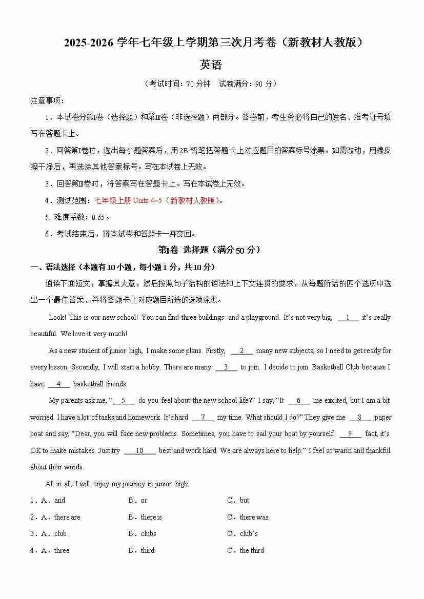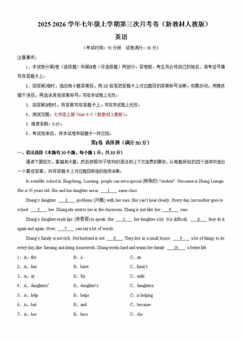 七年级英语第三次月考(考试版A4)(重庆专用)
