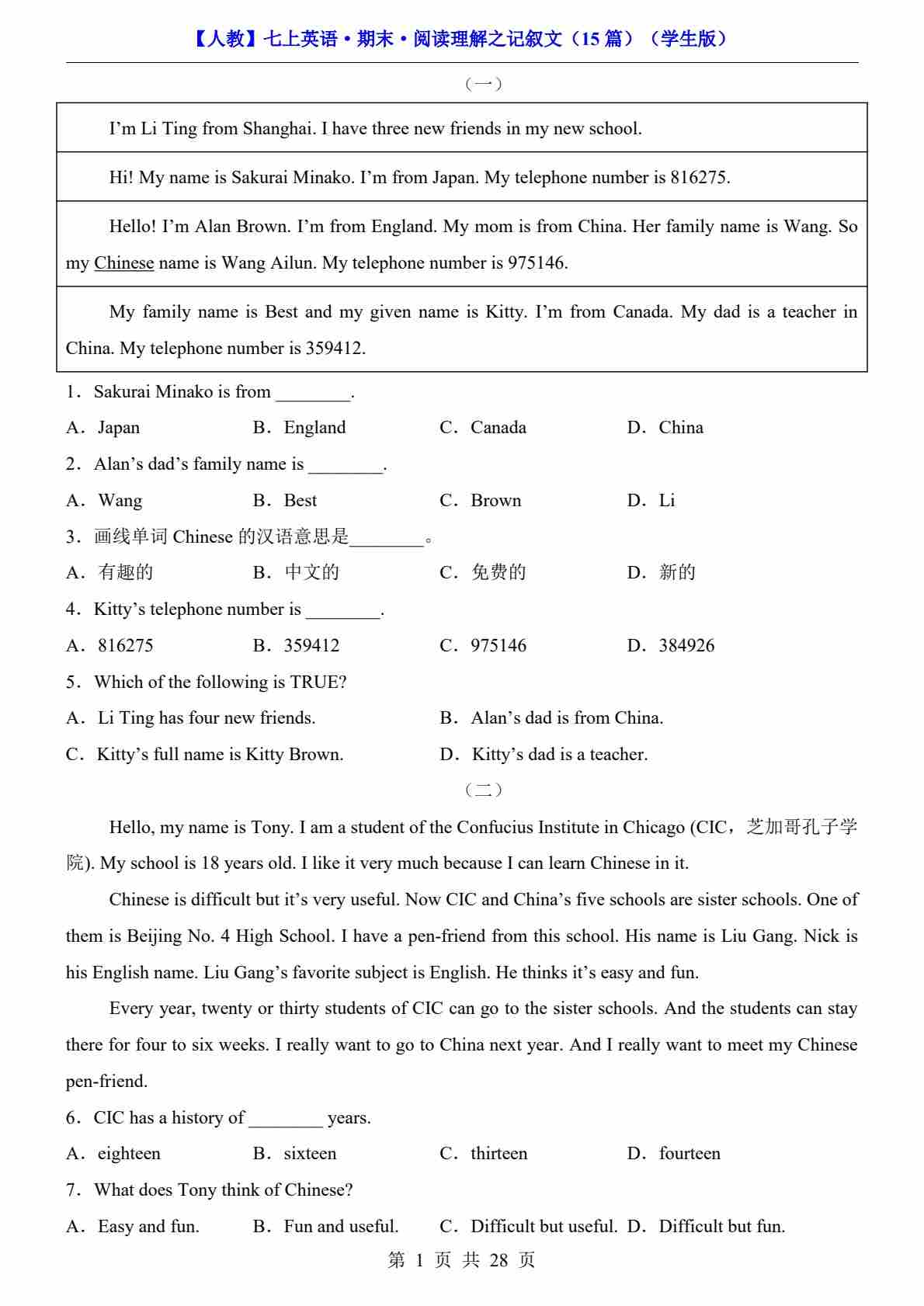【人教】七上英语期末阅读理解之记叙文15篇