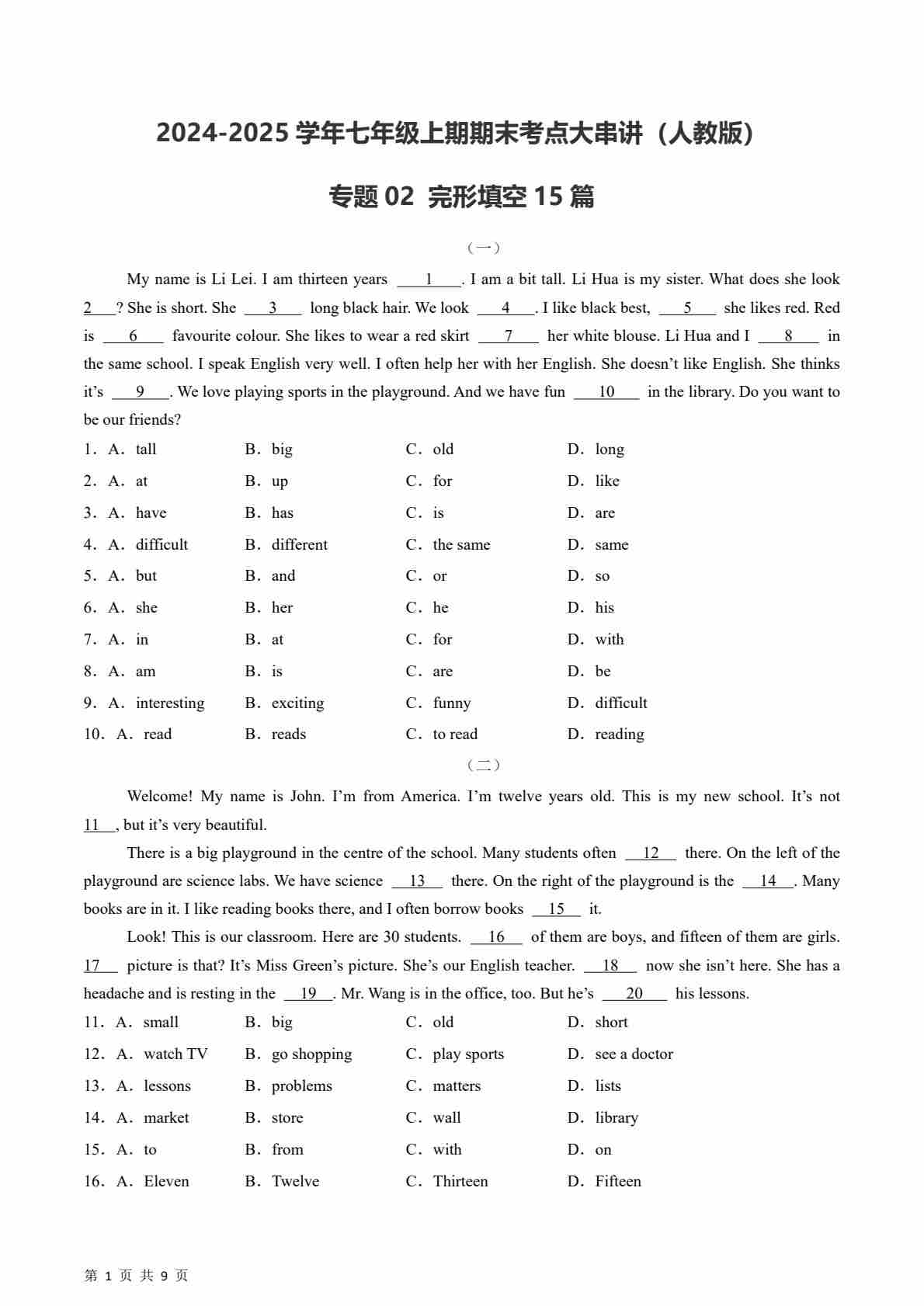 专题02 完形填空 【期末必刷15篇】(原卷版)